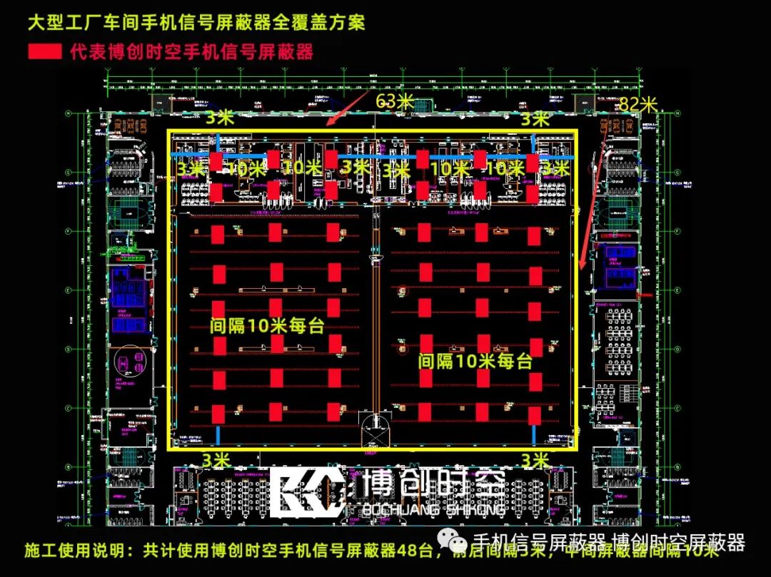 除了考试作弊针对工厂重要设备使用车间,由于操作大型机械设备时玩手机导致重大的人员伤残或者设备操作失误导致产品瑕疵对工厂管理带来很大的难度,针对以上问题博创时空屏蔽器工厂针对工厂设备车间设计了手机信号屏蔽器全覆盖设计方案,仅供参考不同车间不同面积搭配不同。